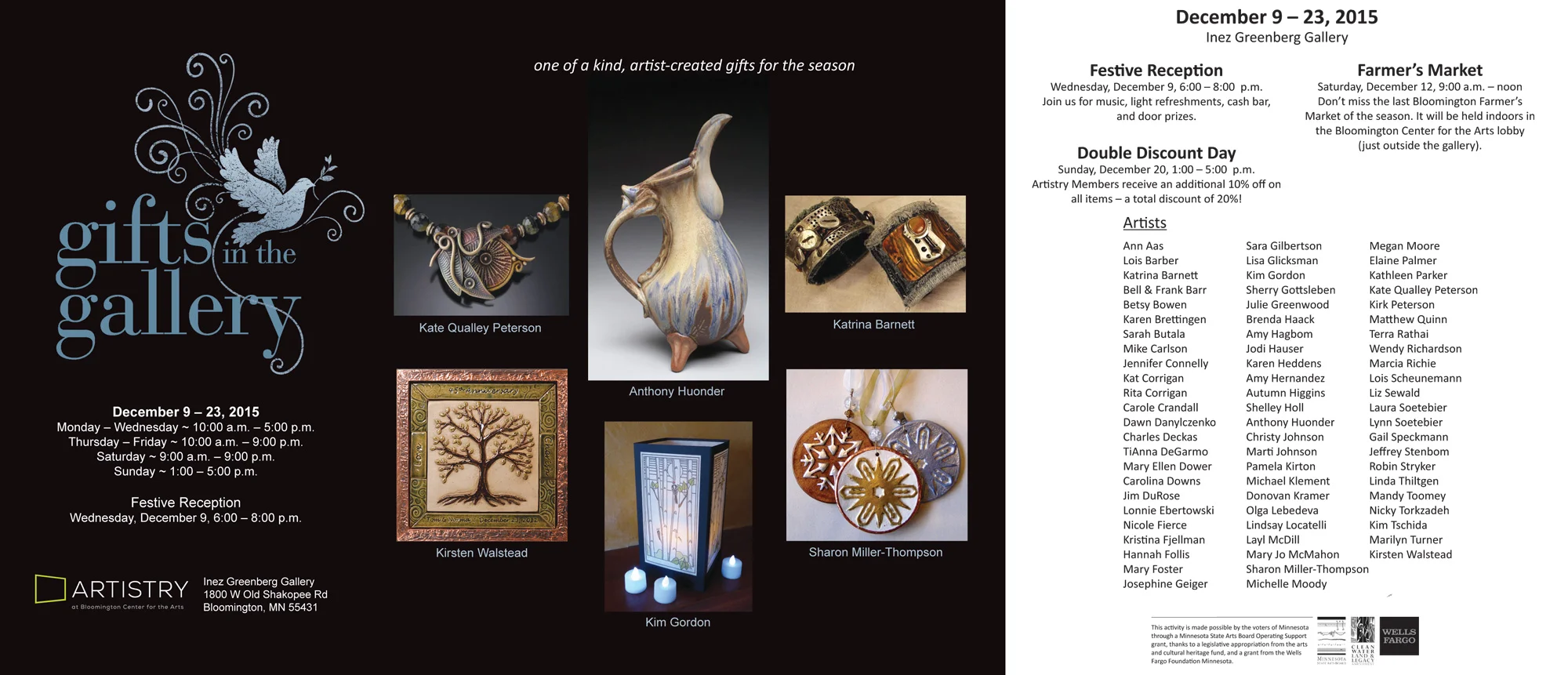 Visit the Inez Greenberg Gallery in December to find distinctive gifts for everyone on your shopping list. Gifts in the Gallery is a two-week boutique featuring a stunning array of items including silk scarves, jewelry, ceramics, blown glass, and much more–all handcrafted by over 60 local artists.